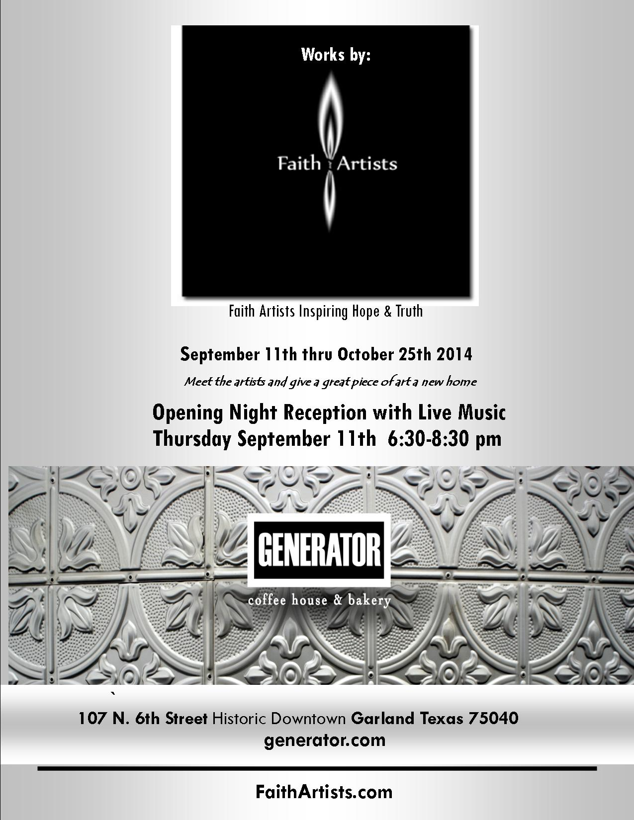 Rosalind Coffee house located at 107 N. 6th Street in historic downtown Garland is hosting a rotating collection by 7 Faith Artists members: Tom Huch, Tom Banker, Debbie Klawetter, Kendra Walden, Kay Williamson, Sheri Hageman, Lori Maclean Open M-Thur 7-7/ Fri 7-9 / Sat. 8-9 / Sun 9-5 art will rotate every 6-8 weeks so keeping checking for new pieces on a regular basis